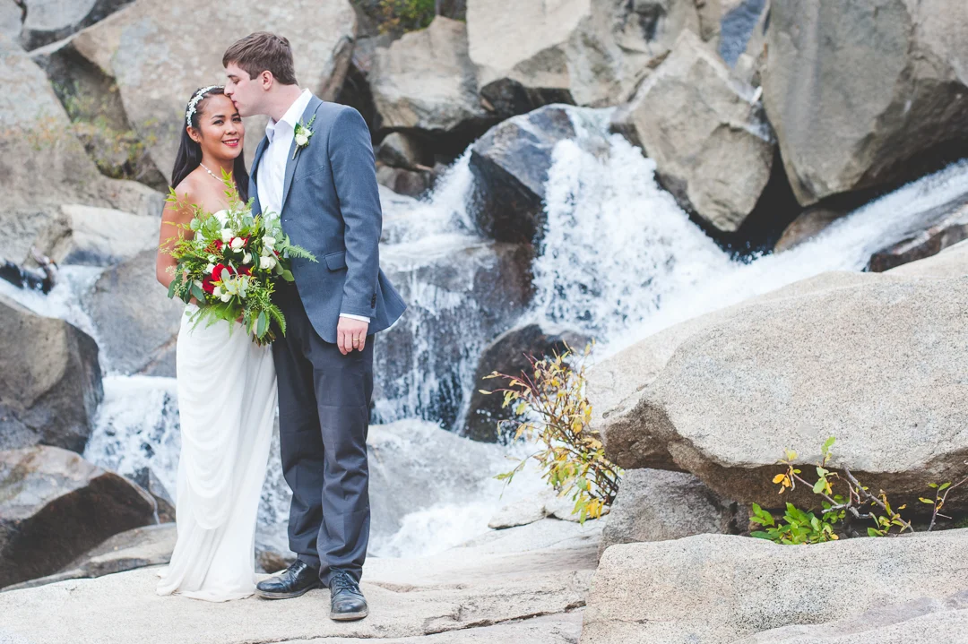 They started celebrating at the top of a large mountain pass, with sprawling views of large mountain walls. We headed next to a historic ghost town in a large valley before ending up at the outdoor wedding ceremony location. Close friends + family met us at the ceremony site, and after a quick ceremony and champagne toast they ended up at the edge of a gorgeous ice-cold waterfall. A real adventure for everyone involved!